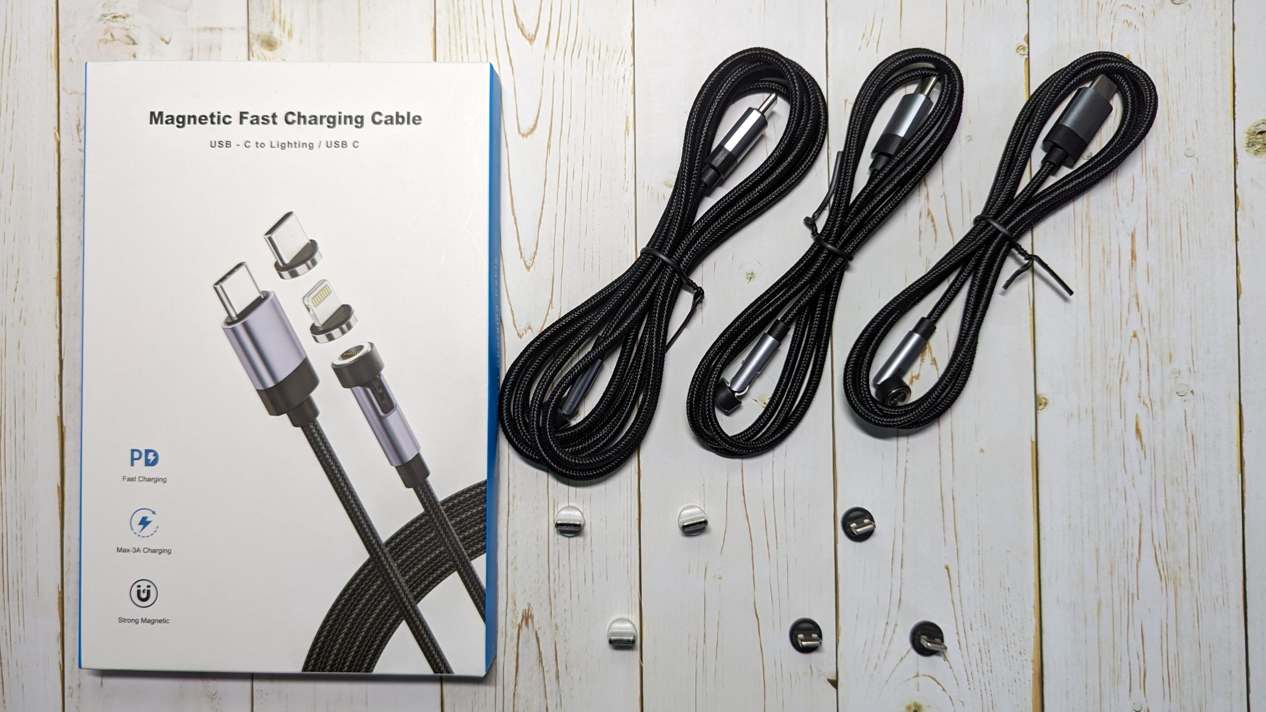 商品の内容ですが1mのUSB-Cケーブルが2本、2mのUSB-Cケーブルが1本の合計3本に加えて、マグネットのUSB-C端子3つとLightning端子3つが梱包されています。(Lightning端子は使わないのでいらないです…。)