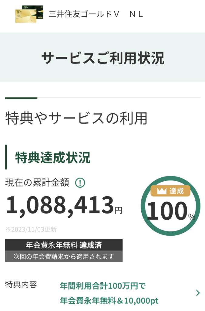 三井住友カードNL ゴールドは年間100万円利用を達成すると、ボーナスで10,000Pがもらえます。