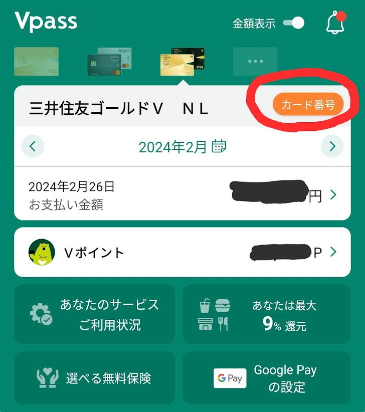 Vpassアプリをインストールすることで、カード情報を確認できます。