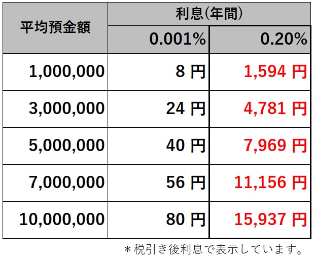具体的にどのくらい利息に差が出るかというと下の表をご覧ください。一般的な普通預金(0.001%)に預けた場合とauじぶん銀行(0.2%)に預けた場合の利息の差を計算しています。