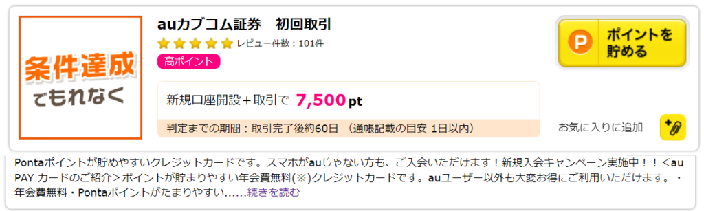 また同じことの繰り返しになりますが、auカブコム証券で口座開設するときはポイントサイトを経由しましょう。証券口座の開設は7,500ポイントも貰えるのでかなり大きいです。ポイントは現金化もできます!
