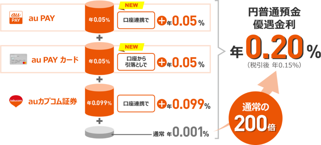 auじぶん銀行でauPAYカードの引き落とし実績が確認できると金利が0.05%上乗せされます。設定や詳細についてはauのページをご確認ください。