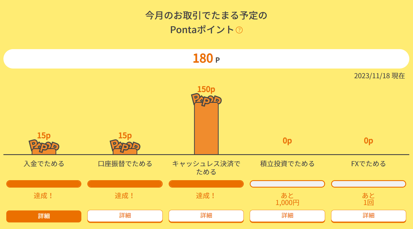 私は毎月3つの条件を達成しており、合計180P/月のPontaポイントをもらっています。