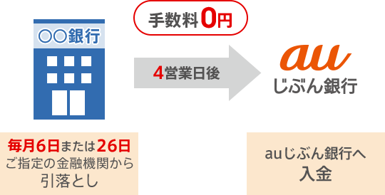 定額自動入金サービスとは毎月6日または26日に、他の金融機関からauじぶん銀行に送金を行ってくれるサービスです。